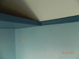 The play house is painted on the inside and has a door. We painted the ceiling an offwhite and the walls a light blue, with dark blue for the trim and the ceiling under the loft.